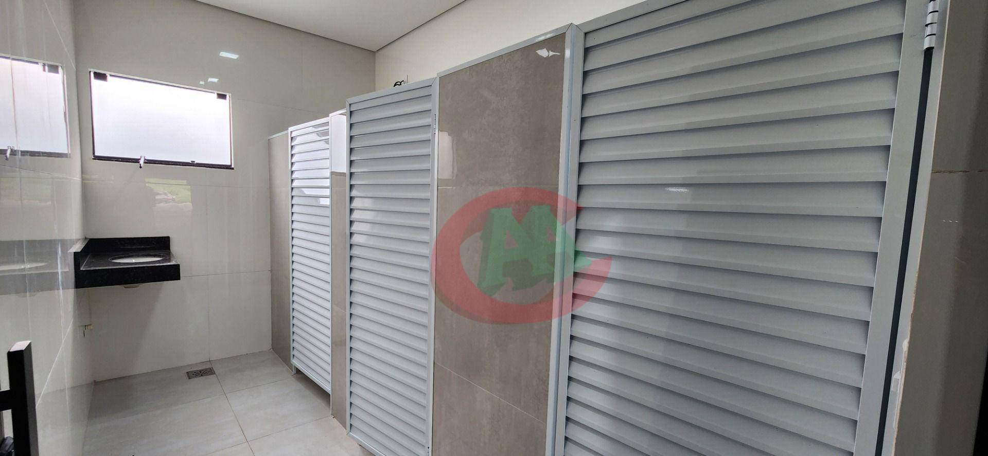 Galpão novo com 410m² de piso fabril com infraestrutura para copa, banheiros/vestiários feminino e masculino, recepção com banheiro PNE e 2 vagas na frente do galpão.