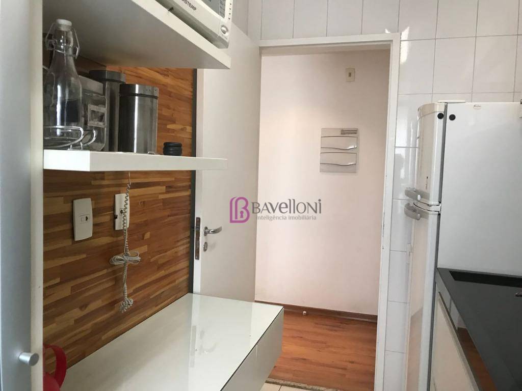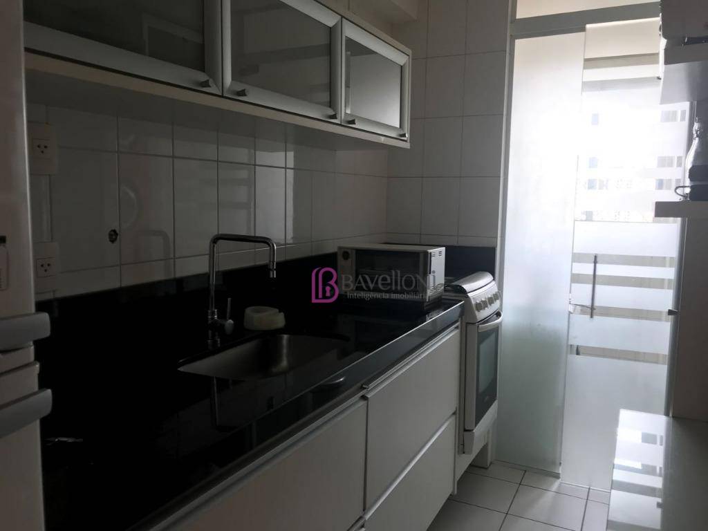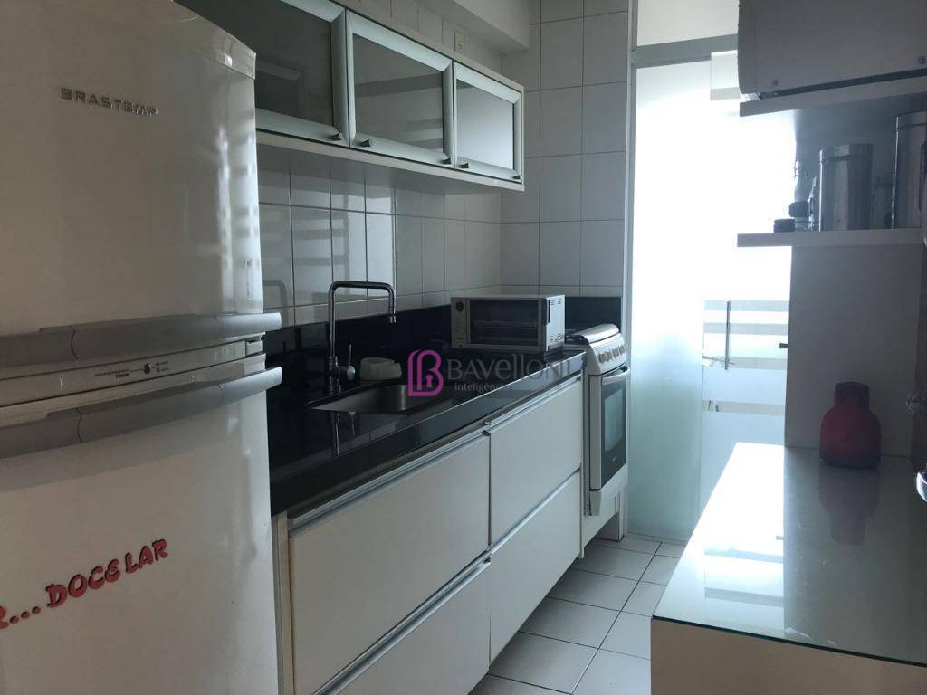 São 2 dormitórios com armários planejados de porta de correr, banheiro moderno com gabinete e box em vidro temperado. A cozinha é toda planejada, equipada com armários e eletrodomésticos, e conectada à área de serviço completa.